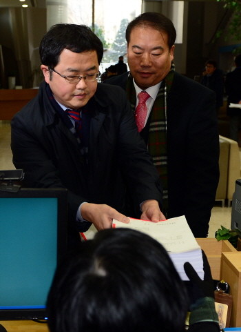 김성훈(왼쪽) 변호사가 10일 오전 서울 서초구 서울중앙지방법원에서 카드사 개인정보유출과 관련해 원고 2808명의 소장을 접수하고 있다. 오른쪽은 장상화 실장.