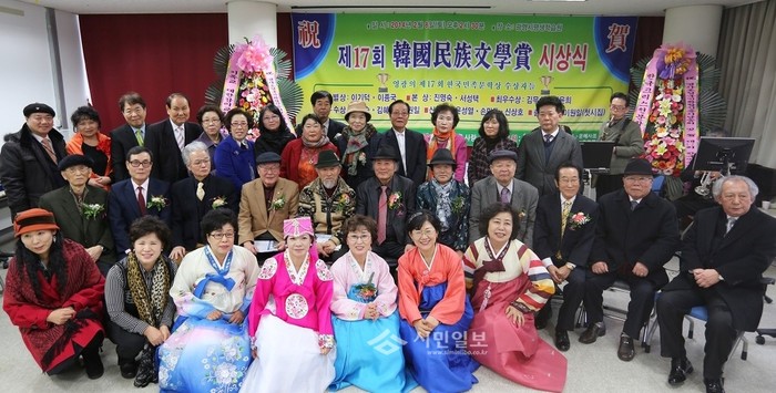 [시민일보]제17회 한국민족문학상 시상식이 지난 8일 경기 광명평생학습원에서 문인들이 참석한 가운데 열렸다. 특별상 이기덕(수필가), 이종국(총신대역장), 본상 진명숙(시인ㆍ수필가), 서성택(시인), 최우수상 김무숙(시인) 등 9명이 받았으며 신인상은 손만득(시인) 등 3명이 받았다. 사진은 시상식을 마치고 수상자들이 기념촬영 하는 모습.