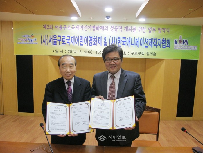 [시민일보]최근 (사)서울구로국제어린이영화제가 구로구청 창의홀에서 (사)한국애니메이션제작자협회와 상호 공동발전 및 우호증진을 도모하고 애니메이션분야의 우수작품을 확보하기 위한 업무협약을 맺었다. 사진은 협약식에 참여한 김한기 영화제 이사장과 김영두 협회장의 모습.