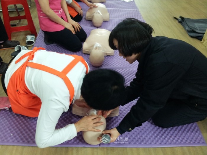 [시민일보]지난 7일 인천부평소방서는 지역내 요양원의 요양보호사 및 관계자들을 대상으로 소화기, 소화전, 심폐소생술 익히기를 홍보하고 체험을 통한 교육을 실시했다. 사진은 강사와 함께 모형을 대상으로 심폐소생술을 체험하고 있는 요양보호사의 모습.