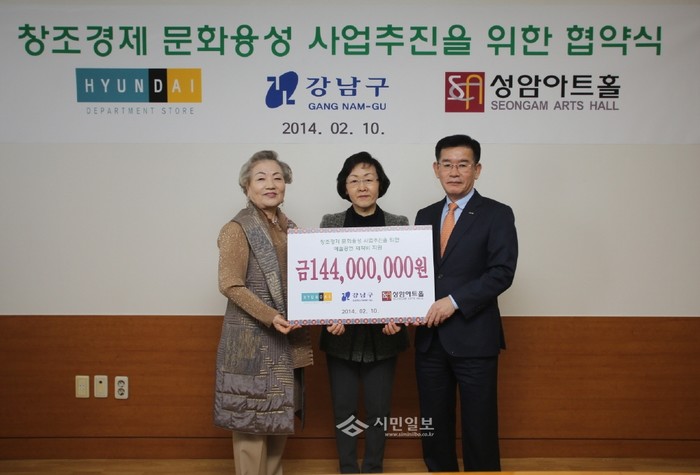[시민일보]지난 10일 오전 서울 강남구는 현대백화점으로부터 연 1억4400만원가량의 예산을 공연사업에 지원받고 성암아트센터로부터 프로그램 개발 및 공연후원을 받으면서 구는 홍보와 행정을 지원한다는 ‘문화융성을 위한 예술공연 협약’을 체결했다. 사진은 각 기관 관계자들의 협약 체결 모습.