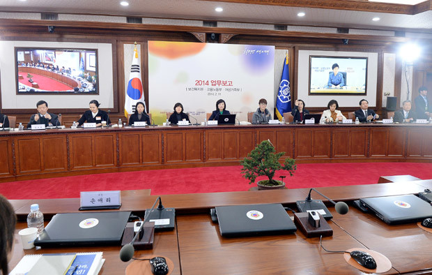 11일 오전 정부서울청사 국무회의실에서 여성가족부, 보건복지부, 고용노동부의 ‘2014년도 업무추진계획’을 보고하는 서울-세종청사 영상회의가 열린 가운데 조윤선 여성가족부 장관을 비롯한 참석자들이 박근혜 대통령의 모두발언을 경청하고 있다.