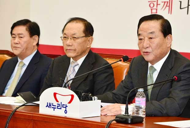 12일 오전 서울 여의도 국회 새누리당 대표실에서 열린 최고중진연석회의에서 서청원 중진의원이 언론에 꼬투리 잡히지 않도록 언행에 신중하라고 이야기하고 있다.