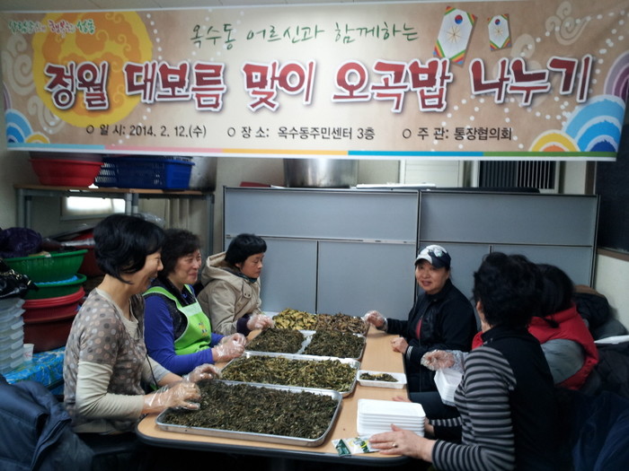 [시민일보] 12일 서울 성동구 옥수동 통장협의회는 정월대보름을 맞아 지역내 저소득 노인들을 대상으로 ‘오곡밥 나누기 행사’를 열어 오곡밥과 나물반찬을 만들어 각 가정에 방문 전달하고 안부를 물었다. 사진은 이날 행사에 참여한 자원봉사자들이 나물을 손질하는 모습.