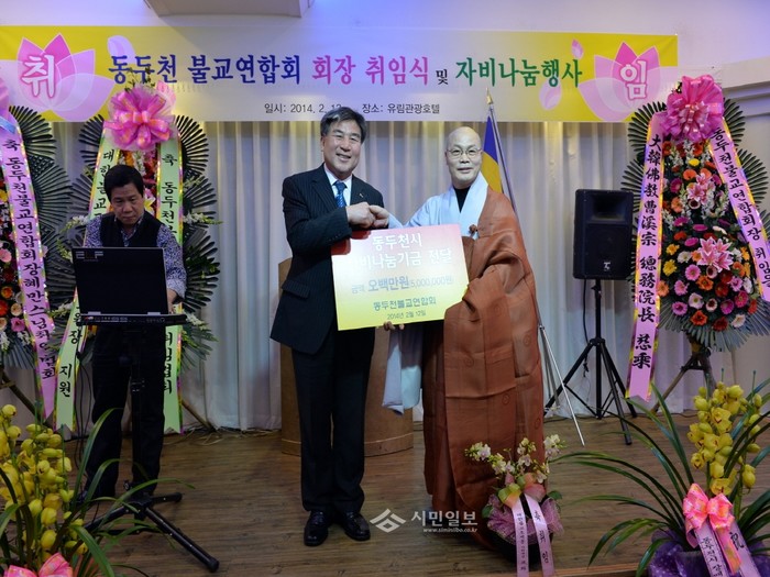 [시민일보]경기 동두천불교연합회에서는 지난 12일 회장 취임식에서 성금 500만원을 동두천시에 기탁했다. 기탁 받은 성금은 기초생활수급자 등 어려운 이웃들에게 전달됐다. 사진은 성금 기탁 후 기념촬영을 하는 오세창 동두천시장(왼쪽)과 동두천불교연합회 회장 혜만스님의 모습.