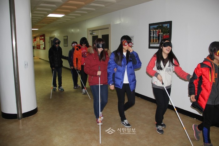| ▲ 지난 1월 중학생들을 대상으로 실시된 '장애체험스쿨'에서 학생들이 장애인과 같은 조건으로 길을 걷는 체험을 하고있다. | ||