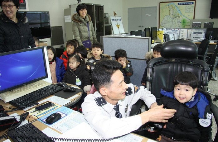 [시민일보]경기 하남경찰서는 19일 지역내 별하유치원생 어린이 15명을 대상으로 112종합상황실·사격장·유치장 등 청사견학과 순찰차 탑승 등 즐거운 경찰서 체험 프로그램 ‘내 꿈은 경찰관’을 운영했다. 사진은 112종합상황실을 체험하고 있는 어린이들의 모습.
