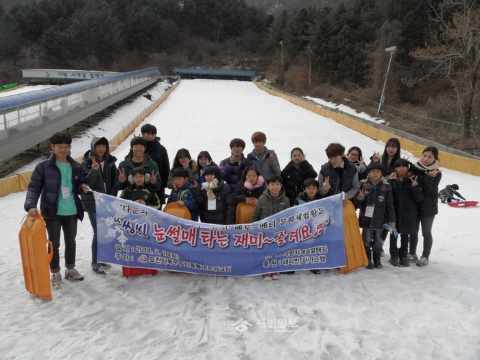 [시민일보]지난 18일 경기 포천시 북부무한돌봄네트워크팀은 지역내 다문화가정 아동들과 이들의 멘토로 봉사활동 중인 자원봉사자들과 함께 문화체험의 기회를 제공하고 추억을 만들기 위해 ‘씽씽 눈썰매 타는 재미~즐겨요’ 행사를 열었다. 사진은 이날 행사 참여자들이 기념촬영을 하는 모습.