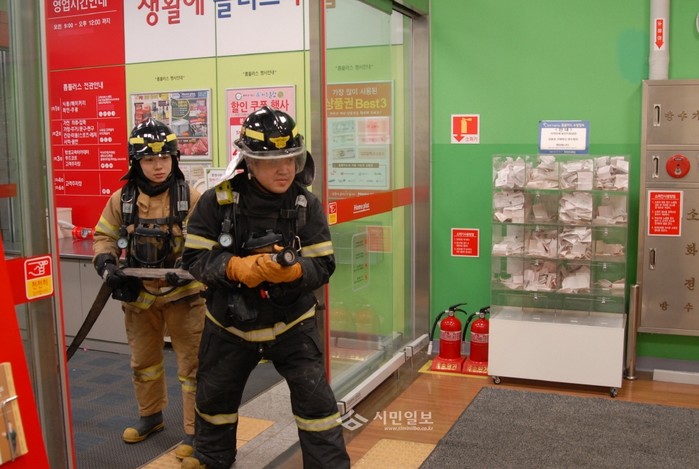 [시민일보]지난 18일 경기 하남소방서가 지역내 화재취약대상인 홈플러스 하남점에서 화재 등의 재난이 발생했을 경우 신속한 재난사고 대응태세를 갖추기 위한 ‘광역 1호’ 출동훈련을 실시했다. 사진은 이날 화재진압 훈련을 실시 중인 소방관의 모습.
