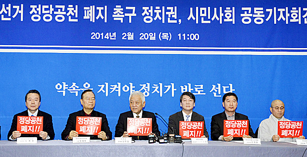 기초선거 정당공천 폐지 촉구 정치권, 시민사회 공동기자회견이 열린 20일 오전 서울 여의도 국회 본관 귀빈식당에서 민주당 김한길 대표와 새정치연합 안철수 중앙위원회위원장이 시민사회단체 대표들과 정당공천폐지 손피켓을 들고 회견을 하고 있다.