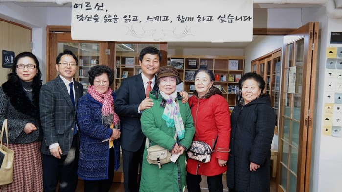 [시민일보]서울 성북구 정릉동에 지난 19일 노인들을 위한 청수도서관이 개관했다. 도서관은 노인들을 위해 글자가 큰 발간물이나 추억의 사진 등 ‘5070자료’로 열람실을 채우고, 작은 평상과 구들장 바닥으로 꾸몄다. 사진은 열람실 앞에서 김영배 성북구청장과 노인들이 기념촬영을 하는 모습.