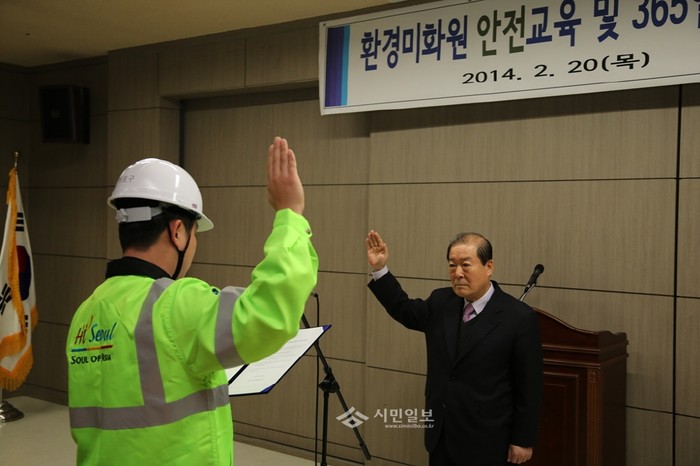 [시민일보]서울 마포구는 20일 환경미화원 90명을 대상으로 안전불감증을 추방해 산업재해 없는 안전한 일터 만들기를 위해 ‘환경미화원 안전교육 및 365일 무재해 실천결의대회’를 열었다. 사진은 마포구 환경미화원 대표가 박홍섭 마포구청장에게 안전선서를 하고 있는 모습.