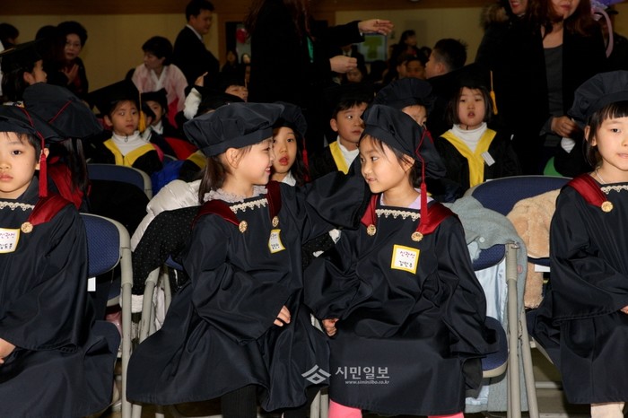 [시민일보]서울 성동구는 21일 구청 3층 대강당에서 민간어린이집 연합졸업식을 열었다. 졸업식은 부채춤, 합창 등 특별공연 후에 축사, 졸업증서 수여, 선생님이 전하는 사랑의 편지낭독, 송가, 답가에 이어 기념촬영 시간 등으로 다채롭게 구성됐다. 사진은 졸업생들이 서로의 학사모를 매만져주는 모습.
