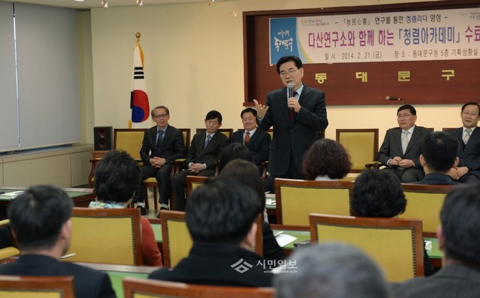 [시민일보]지난 21일 서울 동대문구가 지난해 11월부터 청렴리더를 양성하기 위해 실시해온 '다산연구소와 함께하는 청렴아카데미'의 수료식을 열고 참여자들에 청렴강사증을 수여했다. 사진은 이날 열린 수료식에서 직원들에게 인사말을 하는 유덕열 구청장의 모습.