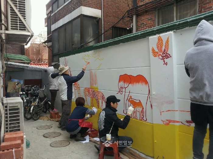 [시민일보]서울 성동구 성수1가동이 구립경로당 앞마당에 조성된 주민커뮤니티공간 샘터마을을 주민들에 알리기 위해 지난 22, 23일 미술단체 '늦바람' 회원들과 함께 벽화그리기 행사를 진행했다. 사진은 23일 벽화를 작업중인 늦바람 회원들의 모습.