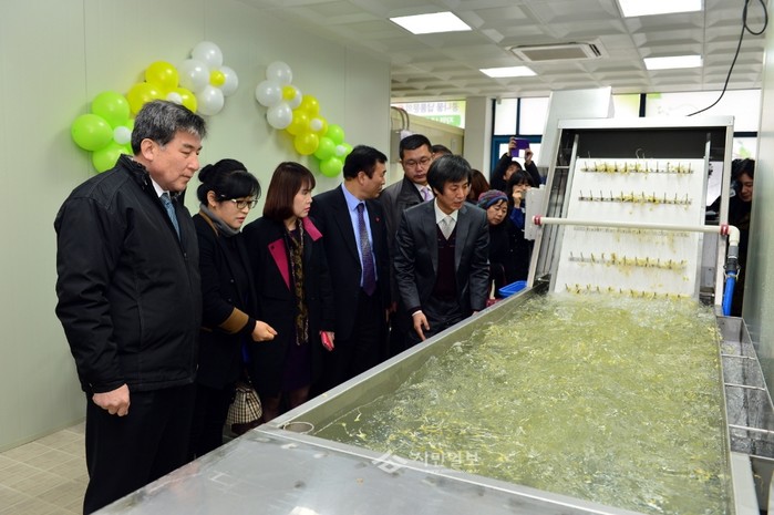 [시민일보]경기 동두천시장애인보호작업장에서 지난 20일 성인 지적·간질·자폐성 장애인을 위한 '햇살촌' 콩나물재배사업장이 개소식을 했다. 사진은 콩나물재배사업장 개소식에 참석한 관계자들이 콩나물이 세척되는 것을 지켜보는 모습.