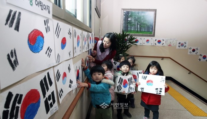 [시민일보]서울 동작구가 3.1절을 맞아 ‘나라사랑 태극기 달기 운동’의 일환으로 지난 24일 어린이집 원아들이 그린 태극기 그림을 구청 벽에 장식하는 행사를 열었다. 사진은 동작구청 어린이집 원아들이 손수 그린 태극기를 구청 계단 내벽에 부착하고 있는 모습.