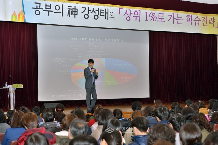 [시민일보]서울 송파구는 26일 오전 10시 구청 대강당에서 '공부의 신' 강성태 대표를 강사로 초빙해 '상위 1%로 가는 학습전략'을 주제로 자녀의 진로방향을 설정·올바른 공부법 제시 등의 내용을 학부모들에게 강의했다. 사진은 강연 중인 강 대표의 모습.