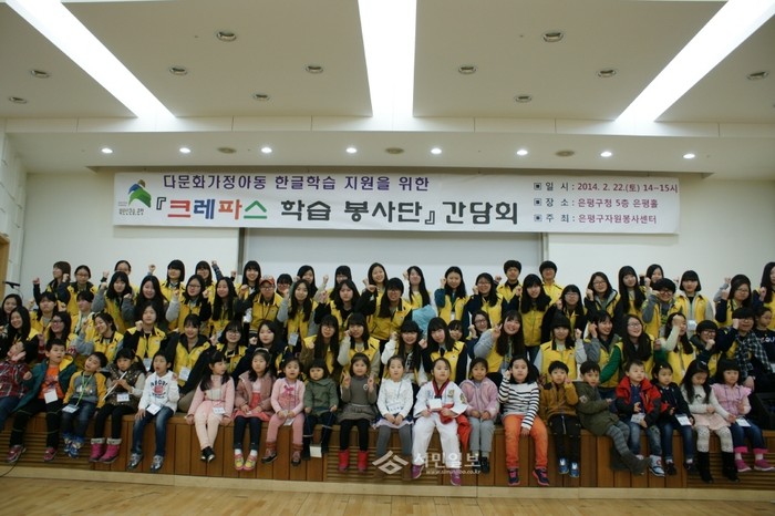 [시민일보]서울 은평구자원봉사센터는 최근 은평구청 5층 은평홀에서 ‘크레파스 학습 봉사단’의 발대식과 간담회를 열었다. 크레파스 학습 봉사단은 지역내 청소년들과 다문화가정 아동을 연결해 한글학습과 멘토 역할을 수행하는 것으로 올해는 청소년 68명이 아동 39명의 멘토가 됐다. 사진은 간담회가 끝난 후 봉사단원과 아동들이 기념촬영을 하는 모습.