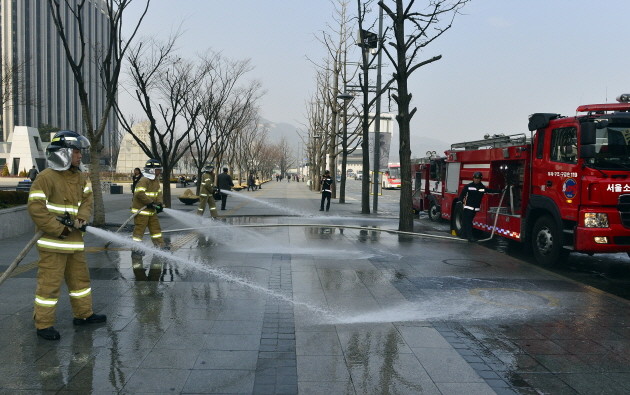 서울시가 소방당국과 합동으로 초미세먼지 주의보 발령에 따른 비상대책으로 26일 오후 서울 세종로 일대에서 분진흡입청소 및 물청소를 실시하고 있다. 서울시는 총 391대의 도로청소차량의 운행거리를 1일 평균 8148㎞에서 1.5배 강화된 1만 2300㎞까지로 확대하고, 물청소와 도로분진흡입청소 횟수를 최대 1일 2회까지 늘린다.