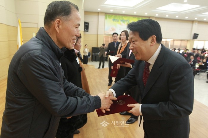 [시민일보]지난 26일 구로구는 구청 5층 강당에서 표창수여식을 열고 이성 구로구청장 등 구 관계자들이 참석한 자리에서 교육·문화·사회복지·청소 등의 지역사회 발전에 노력한 주민 152명에게 표창을 수여했다. 사진은 이성 구로구청장(우)과 표창을 받는 주민의 모습.