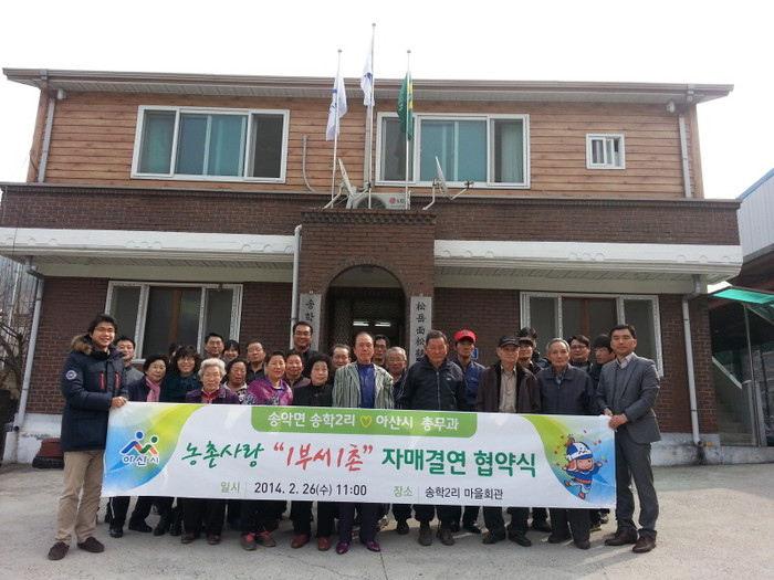 [시민일보]지난 26일 충남 아산시 총무과가 송악면 송학2리 마을회관에서 농촌에 대한 관심을 확대하고 도·농간 상생과 공존을 위해 송학2리와 '농촌사랑 1부서 1촌 자매결연 협약식'을 열었다. 사진은 이날 협약식에 참여한 관계부처 공무원과 주민들의 모습.