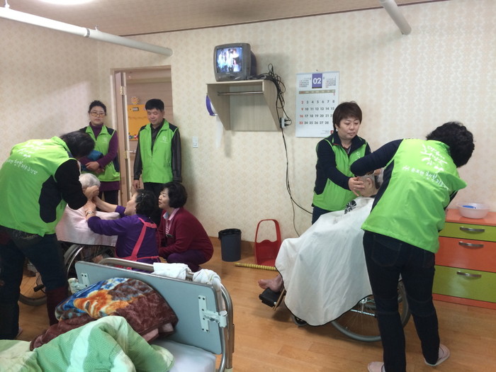 [시민일보]지난 27일 충남 아산시 둔포면 행복키움추진단이 메디케어요양원을 방문해 노인들의 청결하고 건강한 생활에 도움을 주기 위한 이·미용봉사와 화단정리, 후원물품 전달 등의 활동을 실시했다. 사진은 이날 봉사자들이 이·미용봉사 중인 모습.