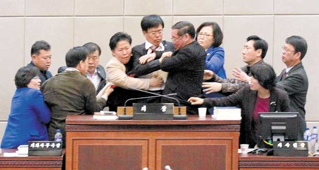 서울대 시흥캠퍼스 조성 협약 동의안을 두고 갈등하던 경기 시흥시의회 여야 의원들이 28일 오전 개회를 앞두고 본회의장에서 몸싸움을 벌이고 있다. 이날 시의회 소수당인 새누리당은 동의안 상정을 반대하며 이귀훈(민·가선거구) 의장의 안건 직권상정을 막기 위해 개회전부터 의장석을 점거했다.