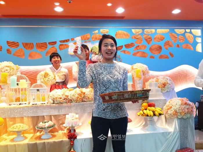 [시민일보] 2일 오후 여자 컬링 국가대표팀이 신미성 선수의 딸 남윤지양의 돌을 축하해주기 위해 한자리에 모였다. 사진은 이날 돌잔치 행사중 신미성 선수의 지목으로 '미녀 돌잡이 도우미'로 즉석 선발된 엄민지 선수가 해맑은 미소와 함께 실뭉치를 들어 올려 보이는 모습.