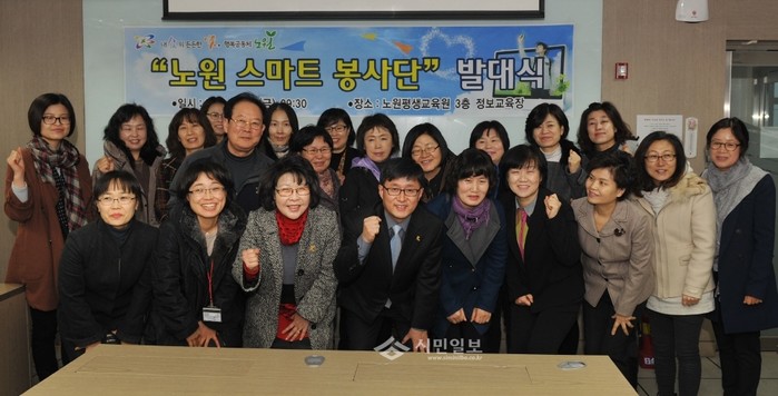 [시민일보]서울 노원구는 소외계층 모바일 정보 격차를 줄이기 위해 최근 노원평생교육원에서 ‘노원 스마트 봉사단 발대식’을 열었다. 23명으로 구성된 스마트 봉사단은 지역내 노인, 장애인 등 정보 소외계층을 대상으로 스마트폰 활용방법을 알려주고, 카카오톡, 트위터 등 SNS 활용 교육 보조강사로 활동한다.