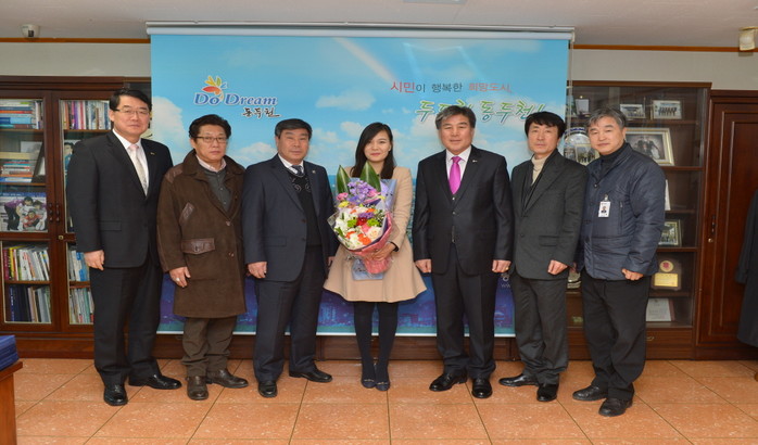 경기 동두천시청 빙상단 소속으로 이주연 전 스피드스케이팅 국가대표 선수가 3일 동두천시 빙상연맹 관계자 등이 참석한 가운데 은퇴식을 가졌다. 사진은 이주연 선수(가운데)와 오세창 시장(오른쪽 세번째) 등 동두천시 빙상연맹 관계자들이 기념촬영을 하는 모습.