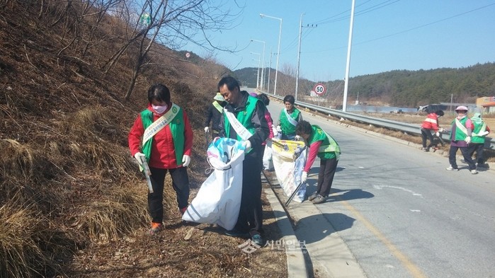 [시민일보]지난 3일 경북 구미시 장천면에서 공무원, 자연보호협의회를 포함한 지역주민 70여명이 봄을 맞이해 나들목과 한천변 일대의 담배꽁초, 쓰레기들을 수거하고 불법광고물을 제거하는 환경정비 활동을 실시했다. 사진은 환경정비 작업 중인 주민들의 모습.
