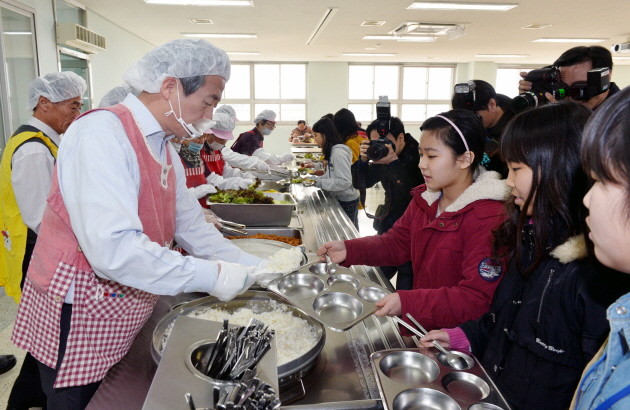 서울시장 출마를 선언한 정몽준 새누리당 의원이 4일 오전 서울 동작구 사당동 남성초등학교를 방문해 급식 배식봉사를 하고 있다.