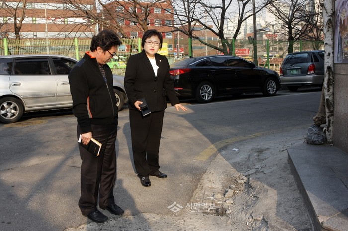 [시민일보]최근 서울 강북구의회 이순영의원이 지역내 도봉로101길 근처의 골목길 도로가 파손되어 도시미관을 해치고 불편을 야기한다는 민원을 접수하고 직접 민원해결을 위해 현장을 방문했다. 사진은 파손된 도로 현장을 방문해 파악하고 있는 이순영 의원(오른쪽)과 관계자의 모습.