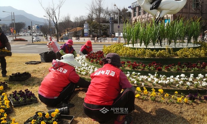 [시민일보]경북 구미시는 5일 봄맞이 준비를 위해 시 전역의 가로변과 조경지, 공한지, 가로화분 등에 팬지와 다양한 초화 등 13만3000여본의 꽃을 식재했다. 사진은 구미시내 화단에 꽃을 심고있는 관계자의 모습.