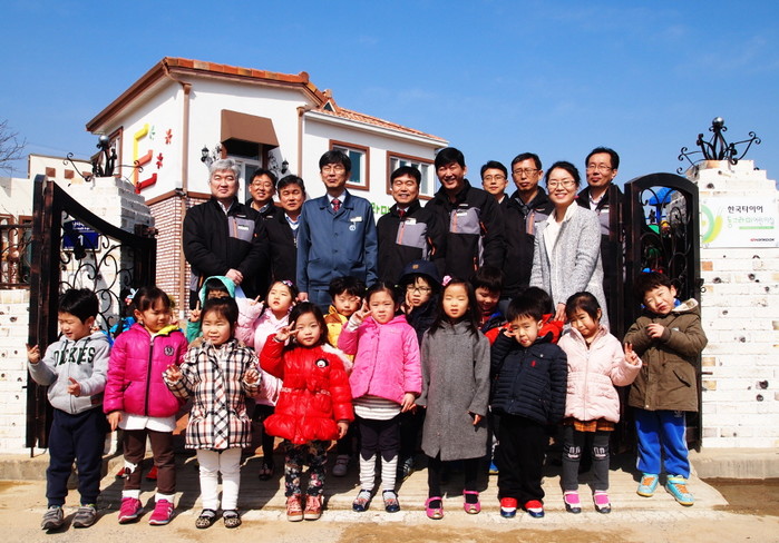 | ▲ 6일 개원한 금산공장 인근에 위치한 '동그라미 어린이집' 앞에서 아이들과 관계자들이 기념촬영을 하는 모습. | ||