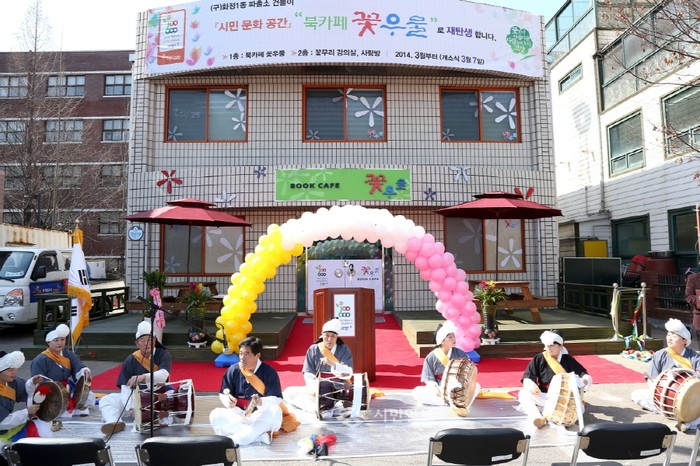 [시민일보]지난 7일 경기 고양시 화정1동에서 차를 마시며 다양한 문화강좌를 들을 수 있는 시민 문화공간 ‘북카페 꽃우물’의 개소식이 열렸다. 사진은 이날 열린 개소식에서 사물놀이패가 축하공연을 펼치는 모습.