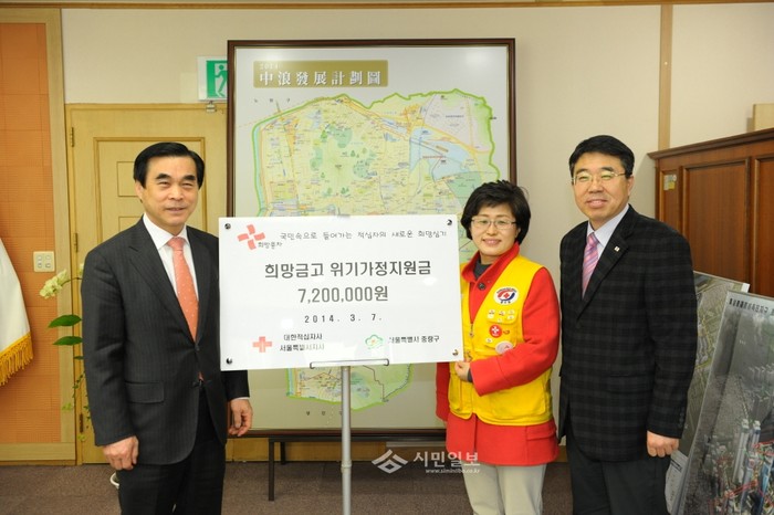 [시민일보]지난 7일 서울 중랑구는 대한적십자사 서울특별시지사로부터 복지사각지대에 있는 희귀병으로 어려움을 겪는 지역내 위기가정을 돕기 위한 긴급 지원금 720만원을 전달받았다. 사진은 이날 전달식에 참여한 문병권 구청장(왼쪽)과 최영운 대한적십자사 중랑노원 희망나눔봉사센터 센터장의 모습.