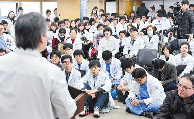 대한의사협회가 하루 전국적인 집단휴진을 강행하기로 한 10일 오후 서울 용산구 대한의사협회 회의실에서 노환규 대한의사협회장의 발언을 전공의들이 경청하고 있다.
