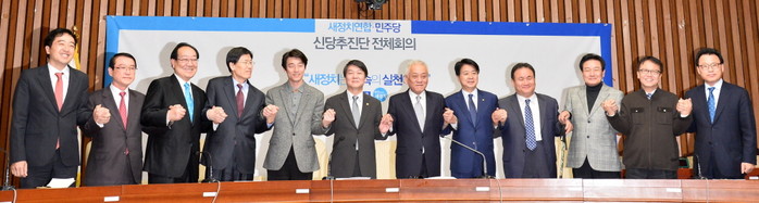 10일 오후 서울 여의도 국회에서 열린 민주당-새정치연합 신당추진단 전체회의에서 참석자들이 손을 맞잡고 있다.