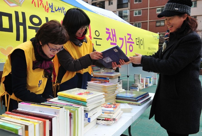 [시민일보]서울 송파구 오금동 현대아파트는 지난 11일 주민들이 다 읽어 필요가 없는 책을 기증하는 '책 기증의 날' 행사를 실시했다. 기증된 책은 동 새마을문고·공유도서관 등 지역 도서관 양서 확충에 우선적으로 활용하게 된다. 사진은 책을 기증하고있는 현대아파트 주민의 모습.