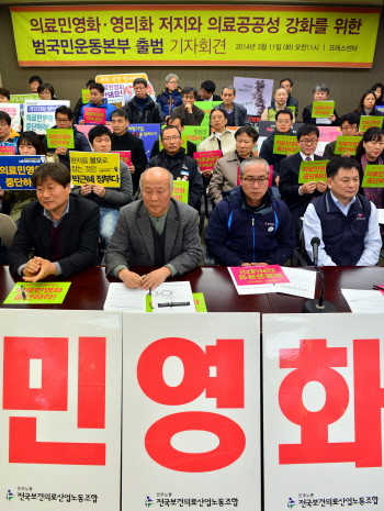 11일 오전 서울 중구 한국프레스센터에서 민주노총 전국보건의료산업노동조합을 비롯한 시민단체 회원들이 '의료민영화·영리화 저지와 의료공공성 강화를 위한 범국민운동본부 출범 기자회견'을 하고 있다.
