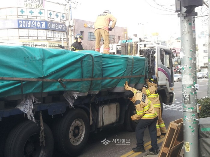 [시민일보]12일 인천 간석시장 국민은행 사거리에서 독성이 강한 발암물질인 페놀 14톤을 실은 화물차에서 페놀이 담겨있는 드럼통이 떨어지면서 내용물이 유출될 뻔한 사고로 인해 남동소방서 간석119안전센터와 구조대가 출동했다. 사진은 대원들이 도로에 떨어진 드러통을 화물차에 다시 안전하게 적재하고 있는 모습.