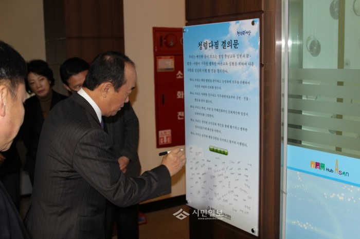 경기 아산교육지원청은 지난 11일 청렴실천 의지를 표명하고자 전직원이 직접 서명한 청렴다짐 결의문을 민원실에 게시했다. 사진은 민원실에 게시된 청렴다짐 결의문에 서명하고 있는 이선영 아산교육장의 모습.