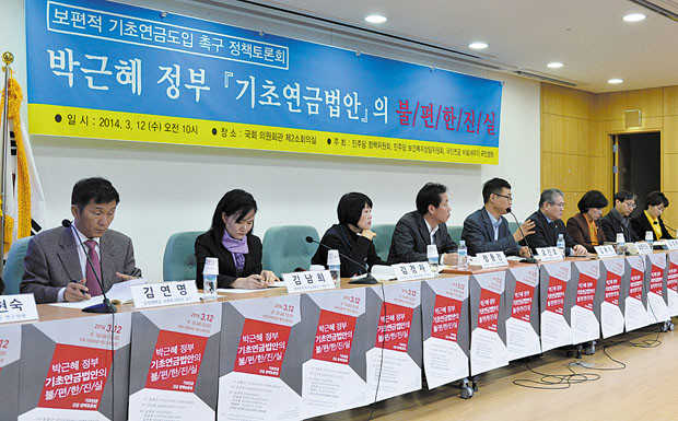 12일 오전 서울 여의도 국회 의원회관에서 열린 ‘보편적 기초연금도입 촉구 정책토론회, 박근혜 정부 기초연금법안의 불편한 진실’에서 국회 보건복지위원회 소속 민주당 이언주(오른쪽부터), 김성주, 남윤인순, 김용익 의원 등 참석자들이 토론을 하고 있다.