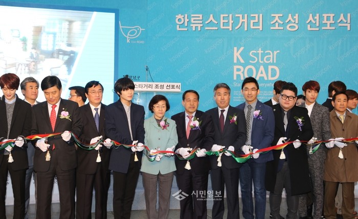 12일 오후 서울 강남구 압구정동 갤러리아백화점 웨스트명품관 광장에서 이야기가 있는 도심형 올레길 'K ROAD'의 서막을 여는 '한류스타거리 조성 선포식'을 개최했다. 사진은 선포식에 참여한 구청장과 이날 K ROAD 홍보를 돕기 위해 참석한 스타들이 테이프커팅을 하고 있는 모습.