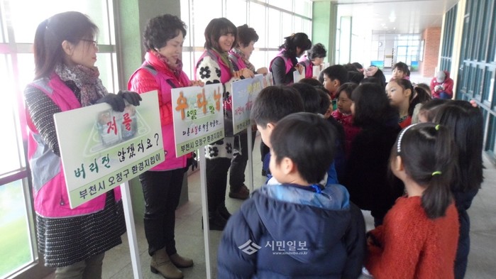 경기 부천 성곡초등학교는 지난 12일 학생들과 음식물 쓰레기로 인한 환경오염을 줄이기 위해 매주 수요일을 ‘잔반 없이 다 먹는 날’ 이란 뜻의 ‘수다날(수요일은 다 먹는 날)’로 지정하고 캠페인 활동을 펼쳤다. 사진은 오정구청 자원봉사자들이 성곡초등학교 복도에서 피켓을 들고 캠페인을 펼치고 있는 모습.