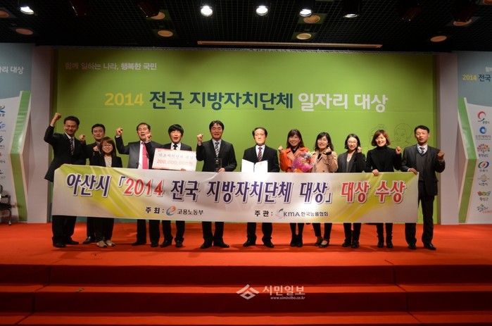 경기 아산시는 고용노동부가 지난 12일 주최한 '2013년 지역 일자리 목표 공시제 추진실적 평가'에서 전국 223개 기초자치단체 중 최우수기관으로 선정됐다. 사진은 대상을 받고 기념촬영 중인 아산시 관계자들의 모습.