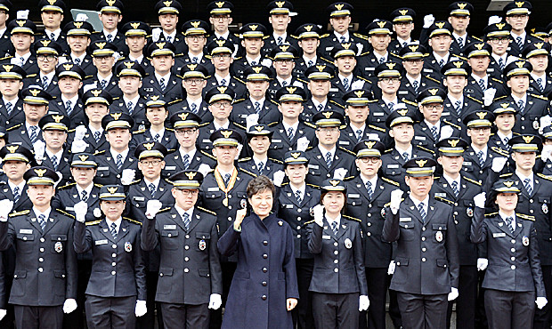 박근혜 대통령이 13일 오후 경기도 용인시 기흥구 언남로 경찰대학에서 열린 제30기 졸업 및 임용식에 참석해 졸업생들과 파이팅을 외치며 기념촬영을 하고 있다.