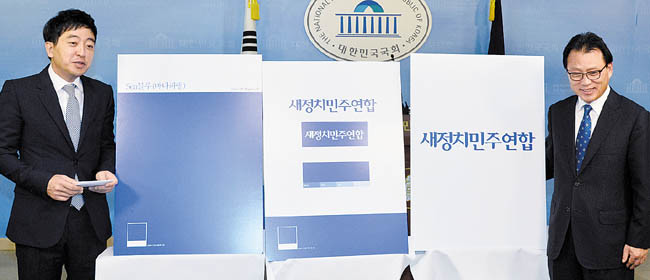 신당추진단 박광온(오른쪽), 금태섭 공동대변인이 16일 오전 서울 여의도 국회 정론관에서 통합신당 당명과 당색을 발표하고 있다. 민주당과 새정치연합은 통합 신당의 당명을 ‘새정치민주연합’으로 결정했으며, 약칭은 새정치연합, 당색은 ‘바다파랑’으로 확정했다고 전했다.
